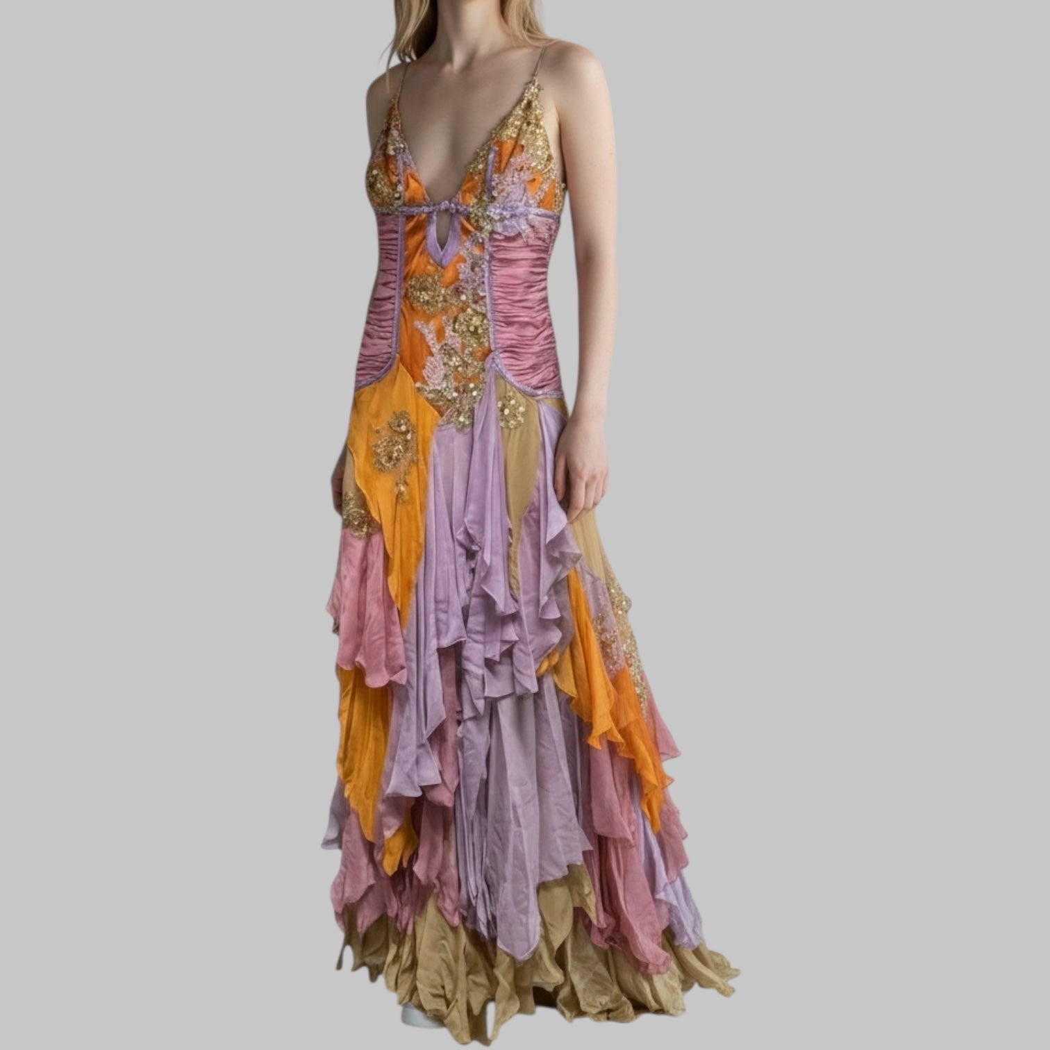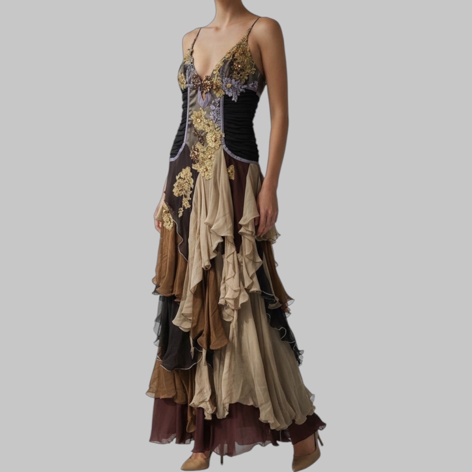 Layered embroidered gown in multicolor tones.