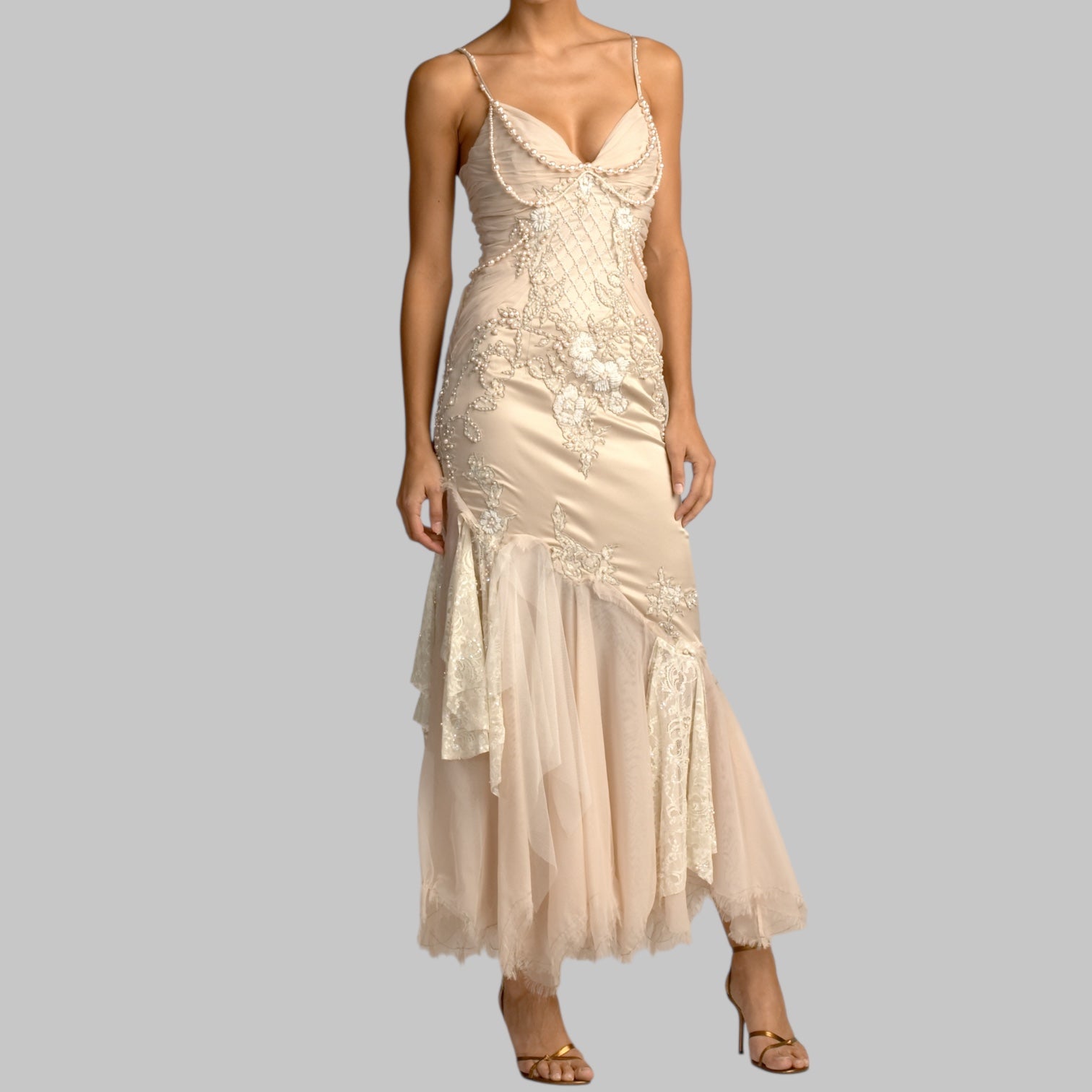 Beaded gown with classic vintage charm and pearl detailing.