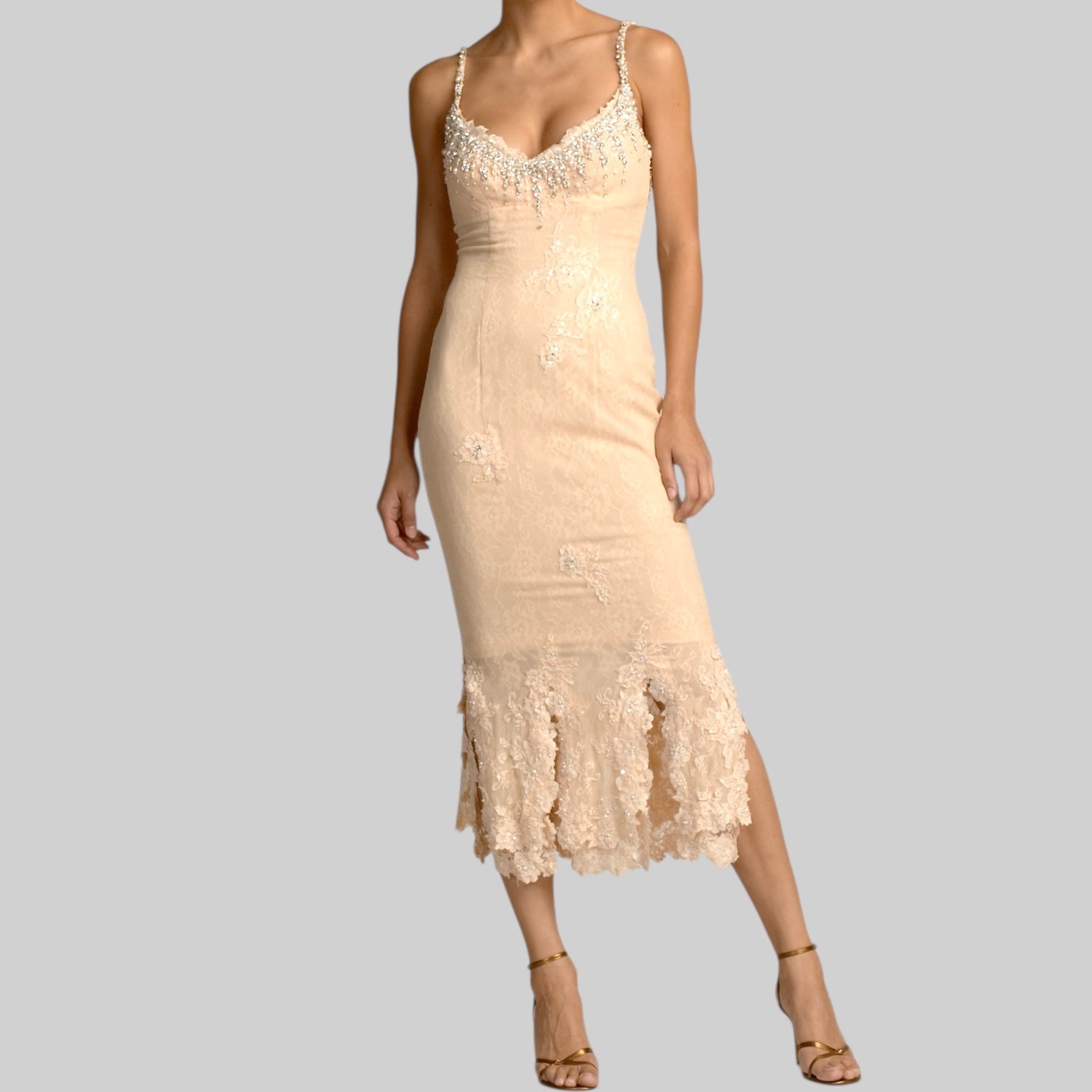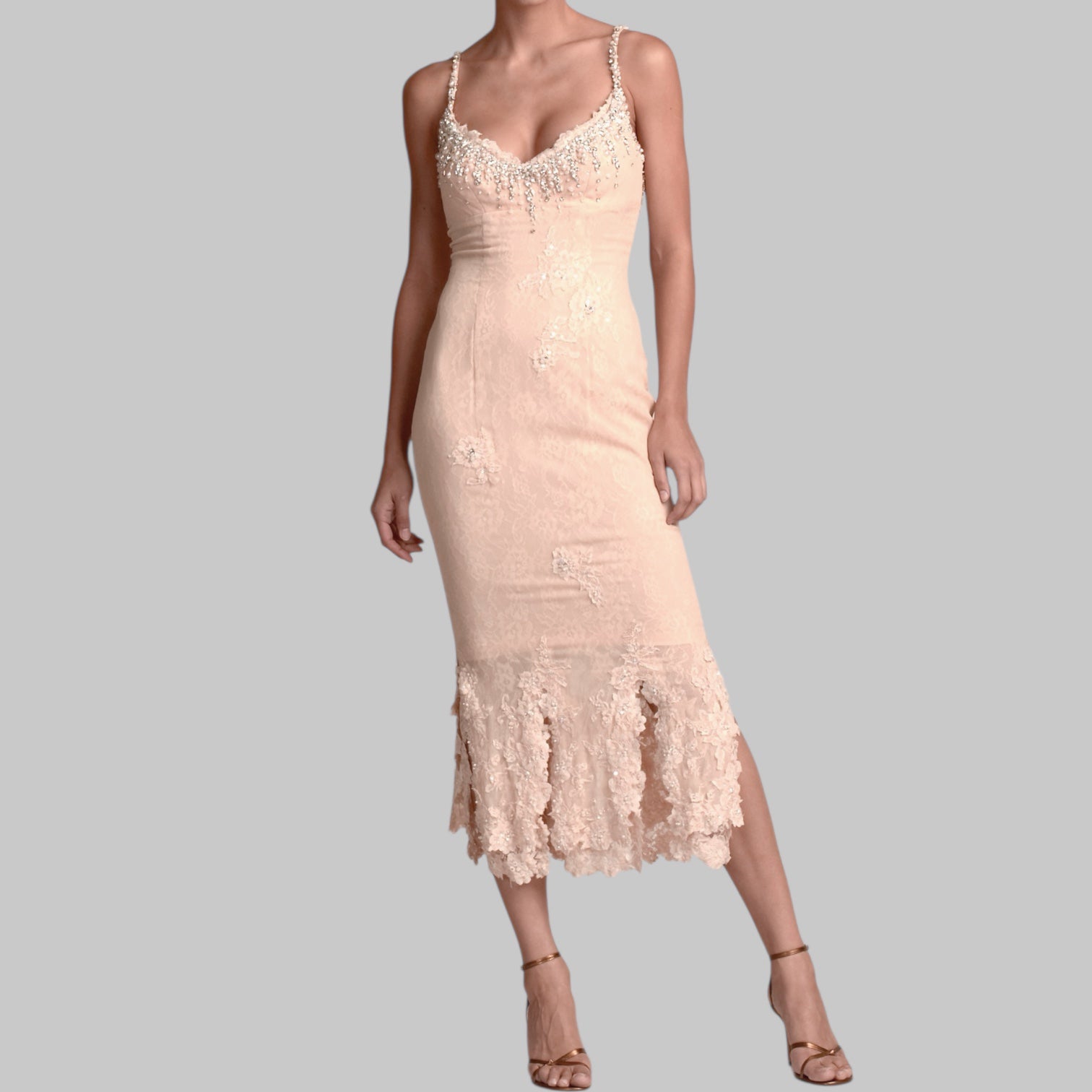 Elegant chiffon and lace dress adorned with pearl and diamante beading.