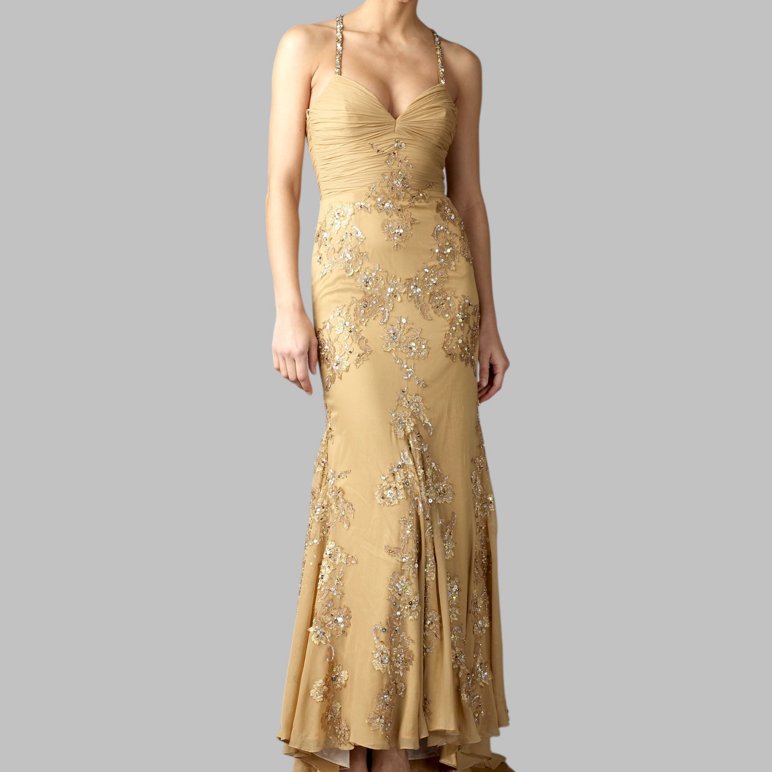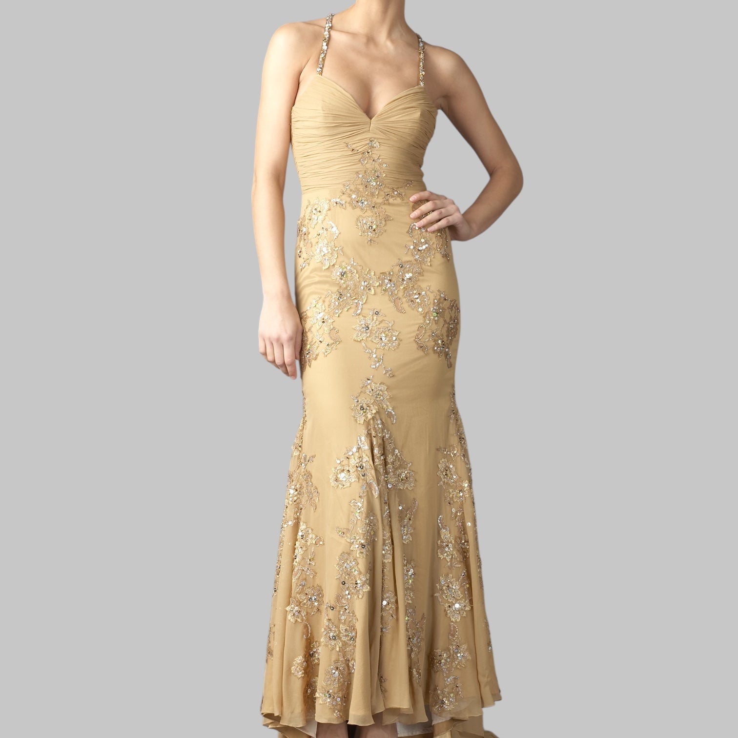 Elegant lace-embroidered gown featuring a distinctive crisscross back and flattering fishtail hem.