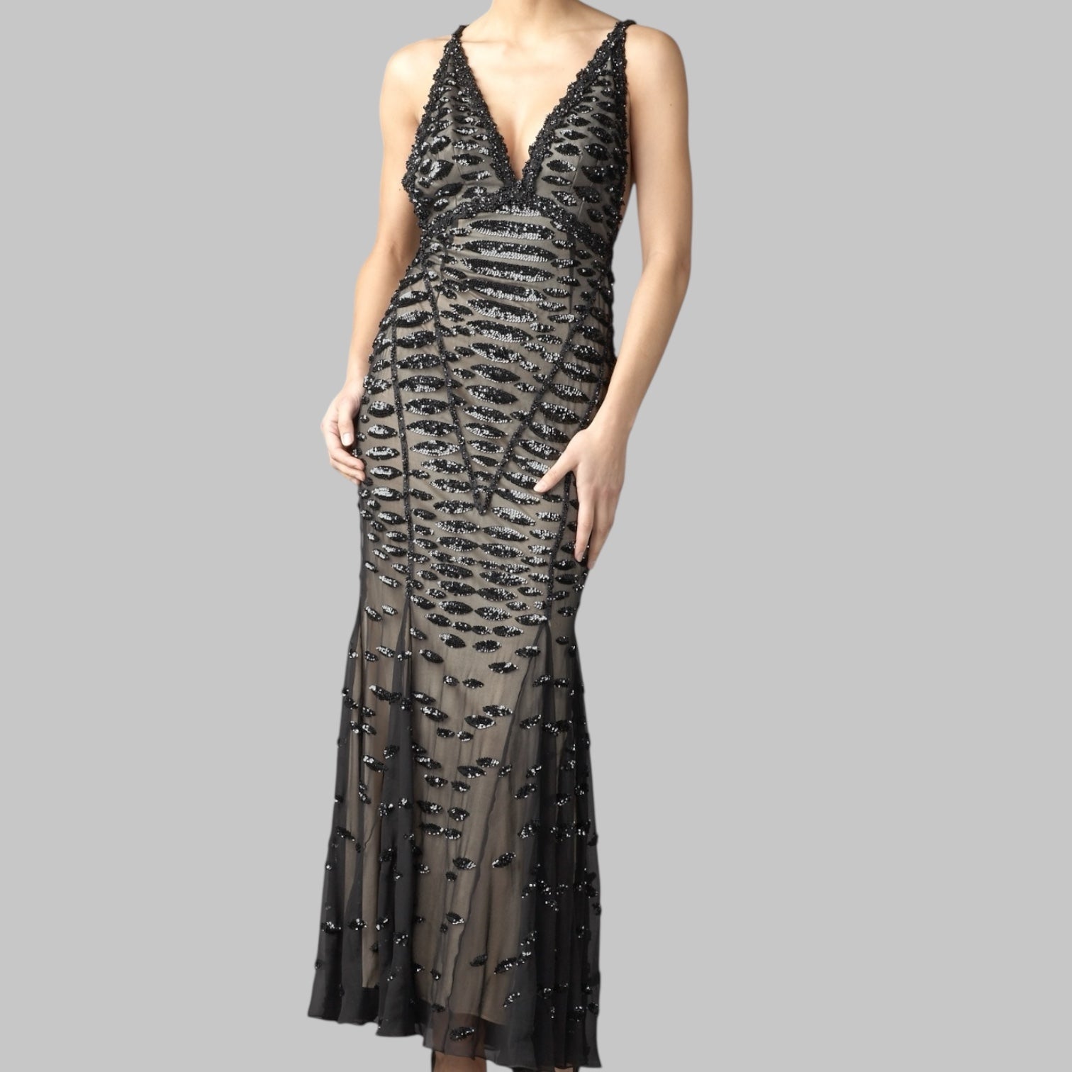 Exquisite gown showcasing meticulous beadwork that spans the entire design for timeless elegance.