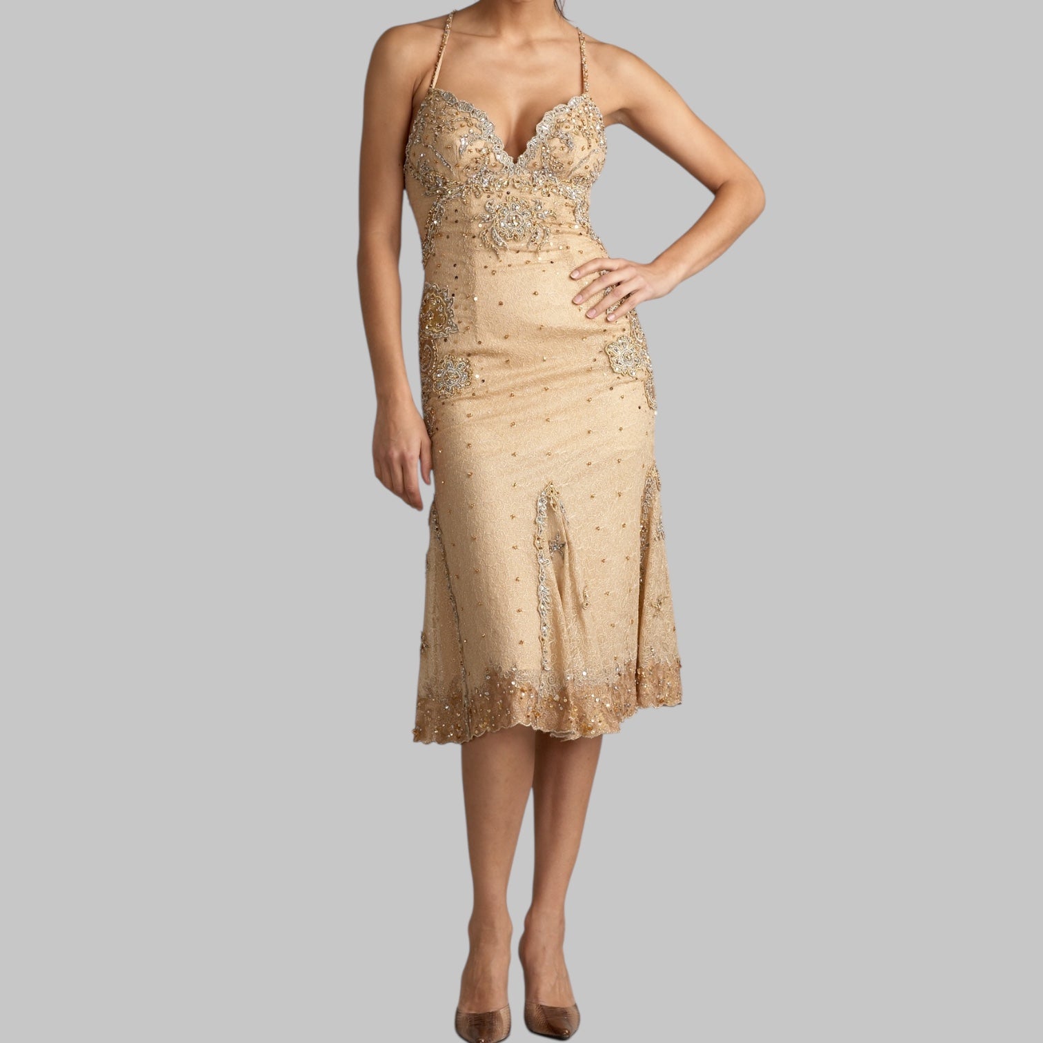 Elegant lace dress featuring intricate embroidery and beadwork detailing for a refined, sophisticated look.